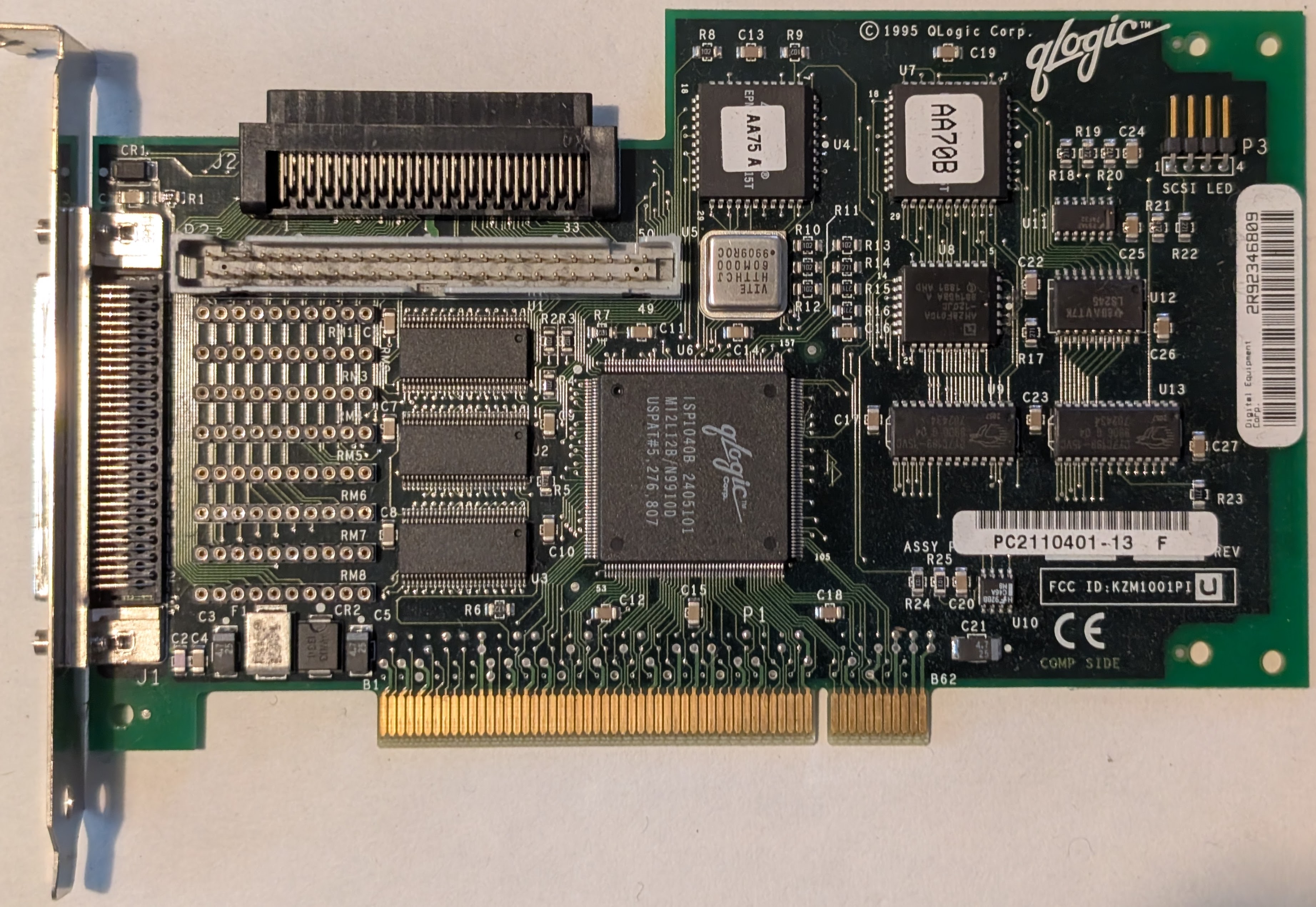 The DEC KZPBA-CY (option KZPBA-CB) is a PCI High Voltage Differential UltraSCSI Host Bus Adapter. DEC seems to have sold these primarily for Alpha workstations and servers, but the manual suggests they should be compatible with x86 PCs as well. The KZPBA was manufactured by QLogic for DEC/Compaq and appears to be based on the QLA1041, though unlike the KZPBA some reports on Usenet suggest the QLA1041 is not compatible with DEC Alpha systems. DEC sold the non-differential variant of this card as the KZPBA-CX (option KZPBA-CA).