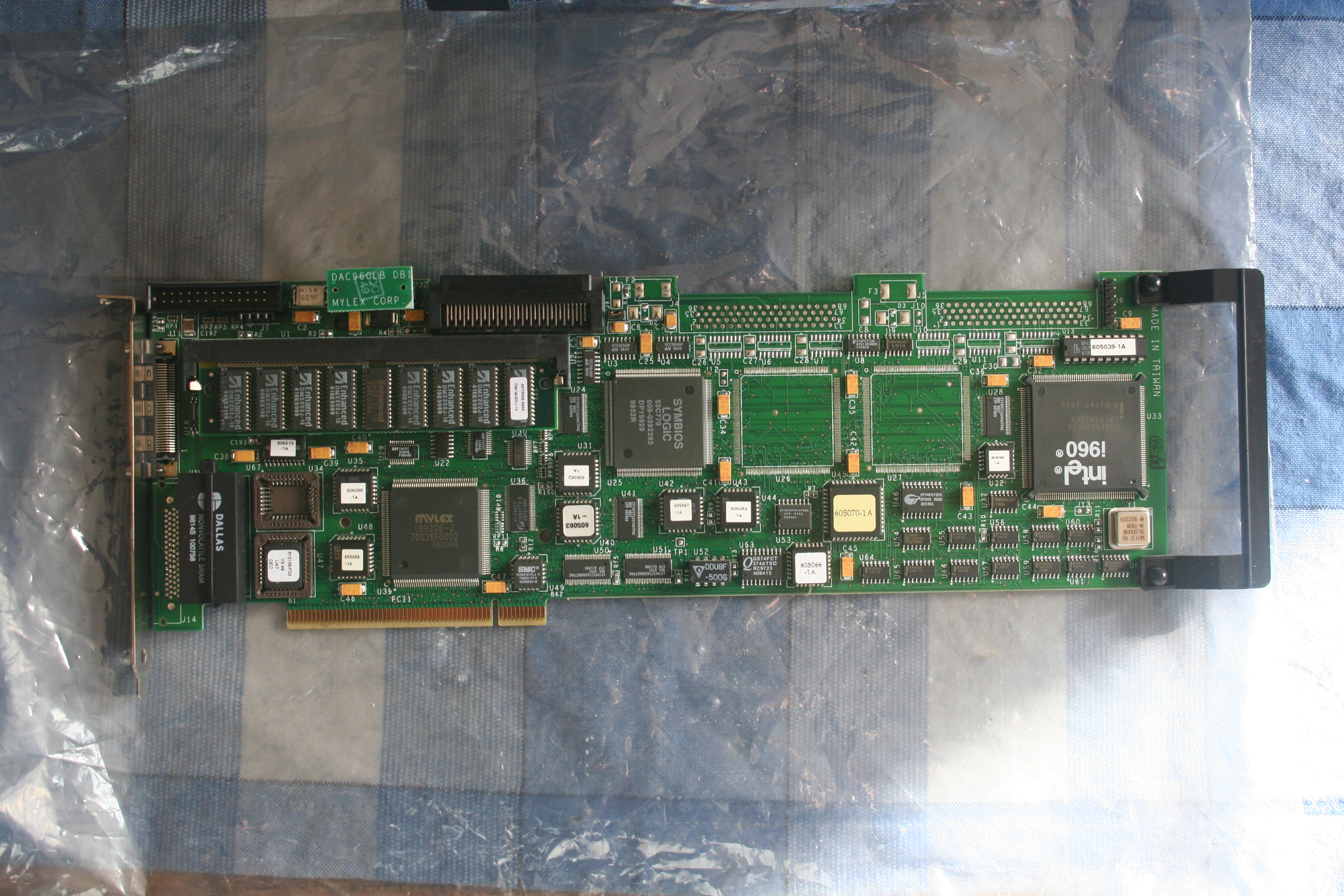 title="Front of the Mylex DAC960 (a KZPAC or something like that). It has an Intel i960 CPU. The black box on the left labeled "DALLAS" probably means the card will die in a few years (there is a battery sealed in there which doesn't last forever)."/>