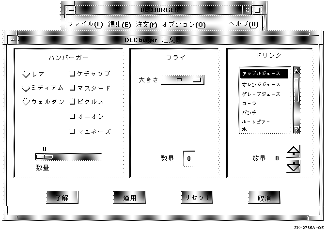 DECburgerは図 2-13に示すように,4 つのXmPushButton ウィジェットが組み込まれているXmFormDialogウィジェットを使用して「了解」, 「適用」,「リセット」,「取消」の機能を実現しています。 ガジェットでなくウィジェットを使用すると,より大きなフォント・ サイズを指定して,これらの重要機能を強調できることに注意してください。 ガジェットではフォントを指定できません。ガジェットはその親で指定されたフォントを使用します( この図はこれらのボタンで使用されている実際のフォントを表していません。 この属性を見るには, DECburgerアプリケーションを実行してください)。