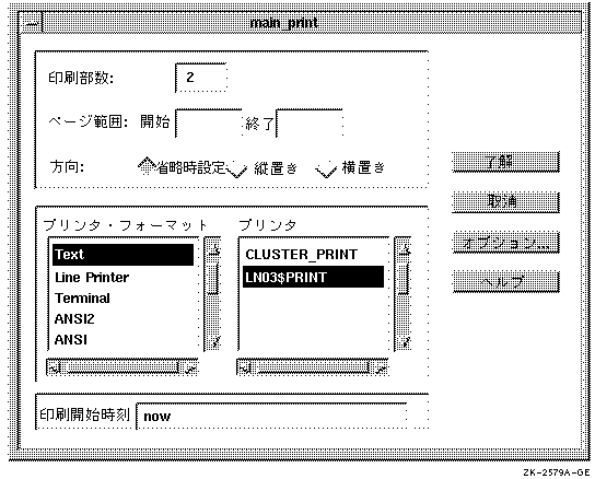 Printウィジェットはグラフィック・インターフェイスを使用して,各種の印刷オプションについてユーザに入力を促すため, ユーザはUNIXのprint コマンドあるいはOpenVMSのPRINTコマンドの構文を知らなくてもファイルを印刷できます。 さらに,PrintウィジェットはOpenVMS論理名を使用して, 利用できるプリント・キューを決定して表示するため,ユーザは特定のOpenVMS システム上でのプリント・キューについての知識を必要としません。