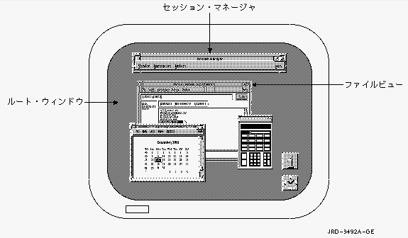 DECwindowsには特殊な作業を行うためのいくつかの構成要素があります。 以下に,基本的なDECwindowsの構成要素を示します。