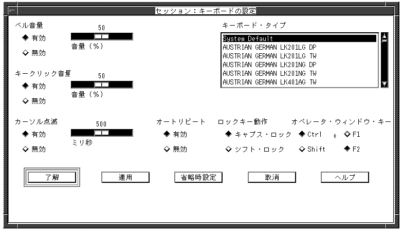 「キーボードの設定」ダイアログ・ボックスでは,キーボード・タイプを変更できます(このダイアログ・ ボックスの他のキーボード設定の変更については, セッション・マネージャのヘルプを参照してください)。キーボード上の文字の位置は, キーボード・モデルによって異なります。使用しているキーボード・ モデルに対応するキーボード・タイプを選択すれば, キーを押したときに対応する正しい文字を表示させることができます。