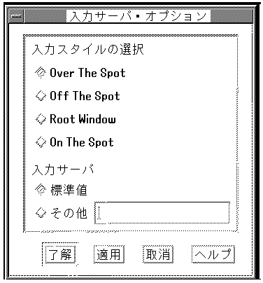 入力スタイルを変更するには,セッション・マネージヤの「オプション」メニューから「入力スタイル... 」を選択し,「入力サーバ・オプション」ダイアログ・ ボックスを表示させます。図 3-5 に,「入力サーバ・オプション」ダイアログ・ボックスを示します。