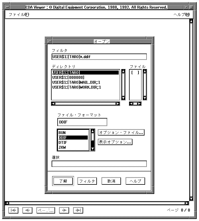 CDAビューアのウィンドウが表示されます。そして,表示するファイルを選択するための「オープン」ダイアログ・ ボックスも表示されます。図 6-8にCDAビューアのウィンドウとダイアログ・ ボックスを示します。