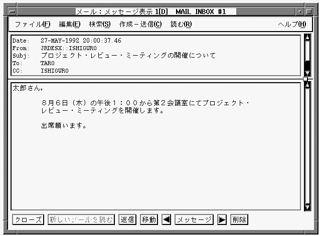 新しいメッセージを読むには,(まだであれば)「電子メール」アプリケーションを起動します。INBOX フォルダ内のメッセージの一覧が表示され, 読んでいないメッセージは,宛名が書かれた封筒に似たアイコンで示されます。 読むメッセージの上でMB1をダブルクリックすると, 「メッセージ表示」ウィンドウにメッセージが表示されます。図 6-15 に「メッセージ表示」ウィンドウを示します。