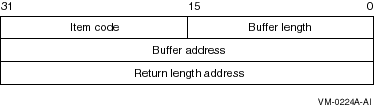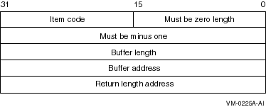 | Return length address | $REGISTRYから返された情報の実際の長さ( バイト数)を指定するワードのアドレスが格納されているロングワード。 情報はbuffer addressフィールドで示されるバッファに格納される。 このフィールドは出力アイテム・リスト・エントリにだけ適用され, 入力エントリの場合は0でなければならない。return length addressが0の場合は無視される。 |
