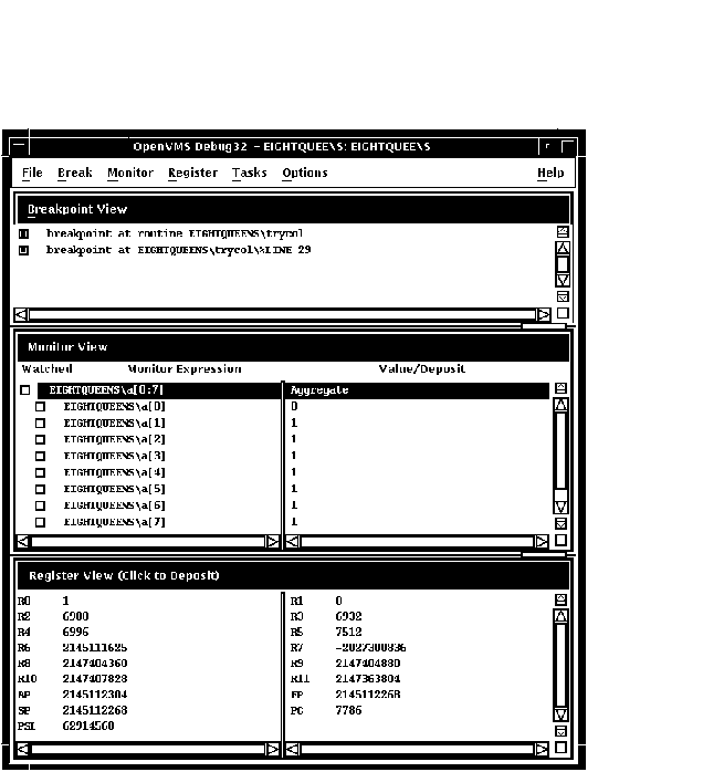 デバッグ・セッションの開始方法についての詳しい説明は,第9章を参照してください。 デバッガの使用方法について説明は, 第10章を参照してください。 本章のプログラムのソース・コードEIGHTQUEENS.EXEについては, 付録 Dを参照してください。