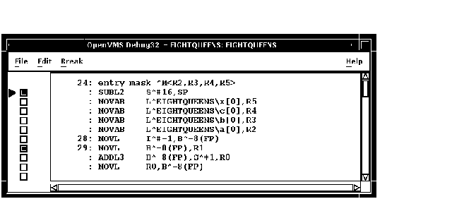 OpenVMSデバッガはソース・レベルのデバッガです。ソース・レベルのデバッガです。 デバッガのソース・ビューには,プログラムの実行が一時停止しているとき, その命令の前後のソース・コードが表示されます。 コンパイラ生成行番号を表示するかしないかはユーザが選択できます。