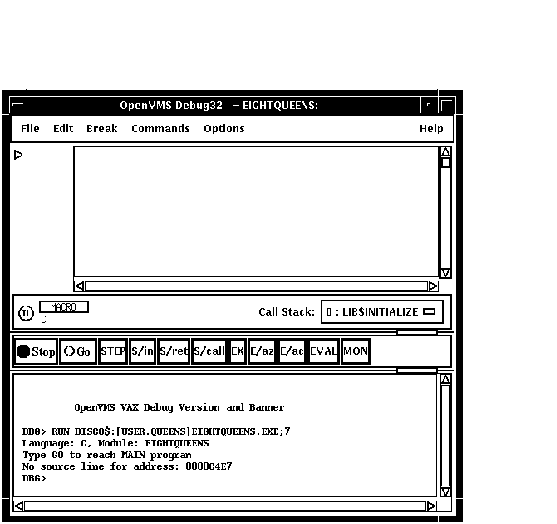 第9.1節で説明している方法でデバッガを起動したときの初期画面では, ソース・ビューは空になっています。 プログラムをデバッガの制御下に置いた後のソース・ビューが図 8-1 に示されています。デバッガで特定のイメージ( この例では,EIGHTQUEENS)を実行すると,プログラムはデバッガの制御下に入ります。