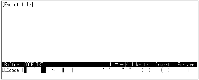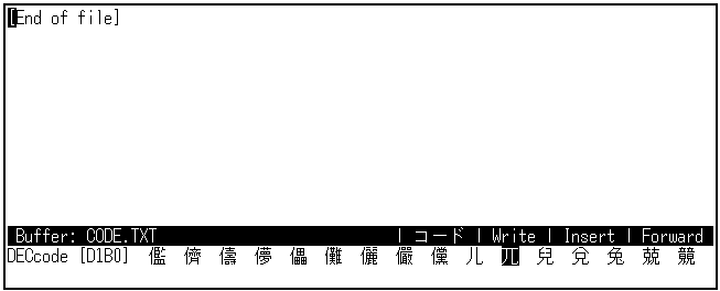 画面の下の表示は,記号モードと似ていますが,コード・モードでは[ ]は空白です。 カナ表示ランプが点灯しているときは,[カナ]キーを押して解除してください。 コマンド・ウィンドウに,DEC漢字コード表が1行ずつ表示されます。