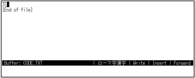 入力と同時に確定されるので,確定のための[Return]キーは必要ありません。 [Select]キーで入力すると,コード・モードを終了せずに"兀"を何度でも入力できます。 [Select]キーで入力したときには,[F10]キーで, はじめのモードに切り替えてください。