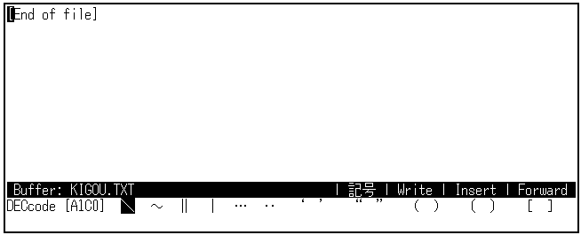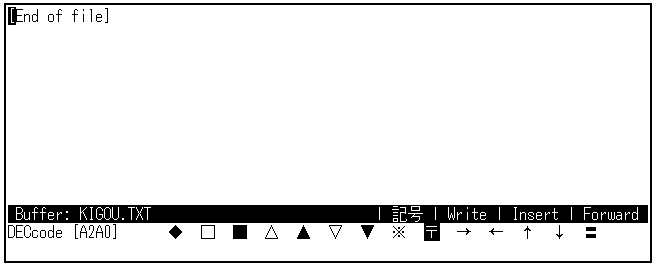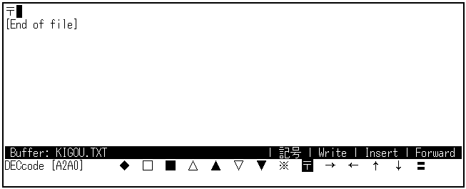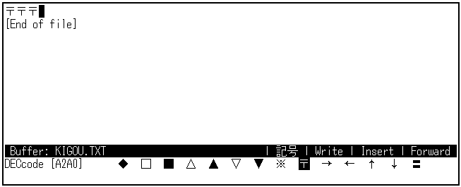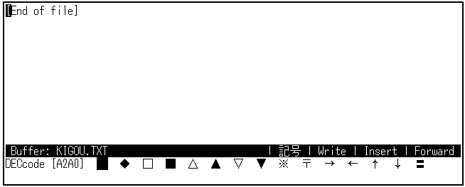 ステータス・ラインに"記号"と表示されるまで[F10]キーを押してください。 カナ表示ランプが点灯したままでかまいません。 コマンド・ウィンドウに,DEC漢字コード表が1行ずつ表示されます。