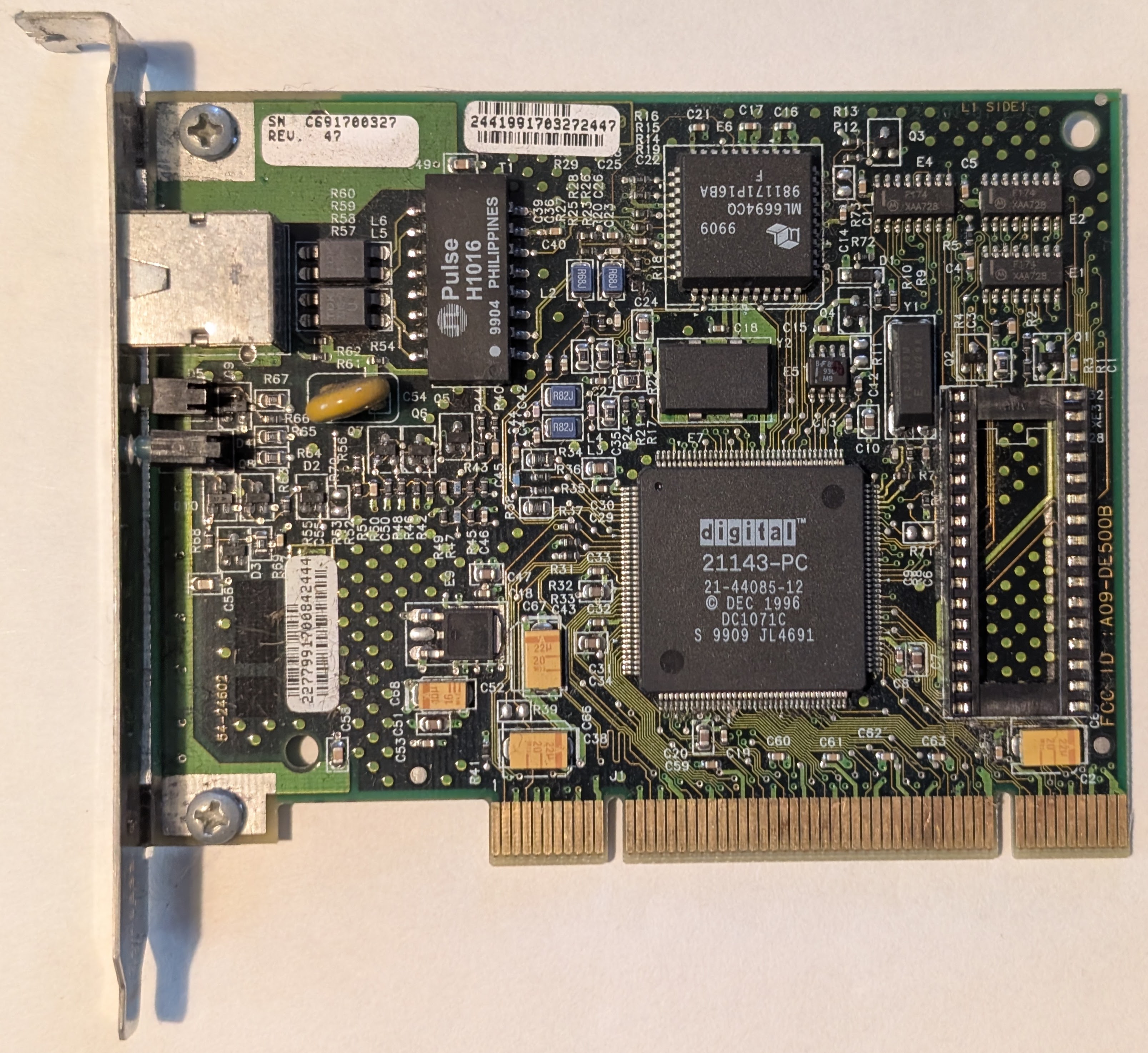 The DEC Fast EtherWORKS PCI 10/100 (DE500) is an early Fast Ethernet (10/100) NIC based on Digital Semiconductors popular DECchip 2114x family of highly integrated Ethernet controllers. When it was launched, DEC claimed that tests rated it faster than those from 3Com, Intel and SMC. Digital provided drivers for most operating systems in common use at the time, and many operating systems DEC did not directly support (BSD, Linux) have their own drivers.