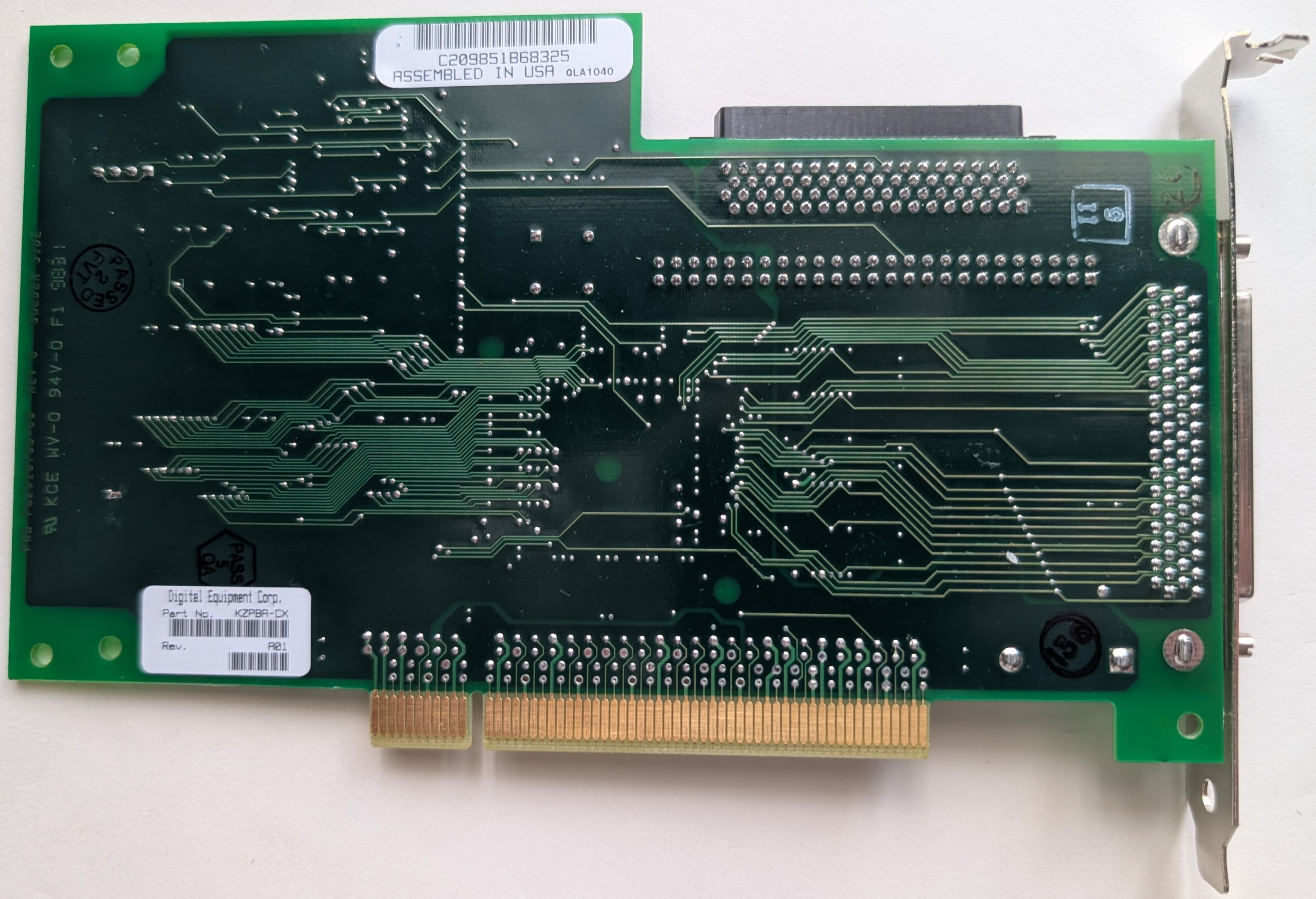 The DEC KZPBA-CX (option KZPBA-CA) is a PCI UltraSCSI Host Bus Adapter. DEC seems to have sold these primarily for Alpha workstations and servers, but the manual suggests they should be compatible with x86 PCs as well. The KZPBA was manufactured by QLogic for DEC/Compaq and appears to be based on the QLA1040, though unlike the KZPBA some reports on Usenet suggest the QLA1040 is not compatible with DEC Alpha systems. DEC sold the high voltage differential variant of this card as the KZPBA-CY (option KZPBA-CB).