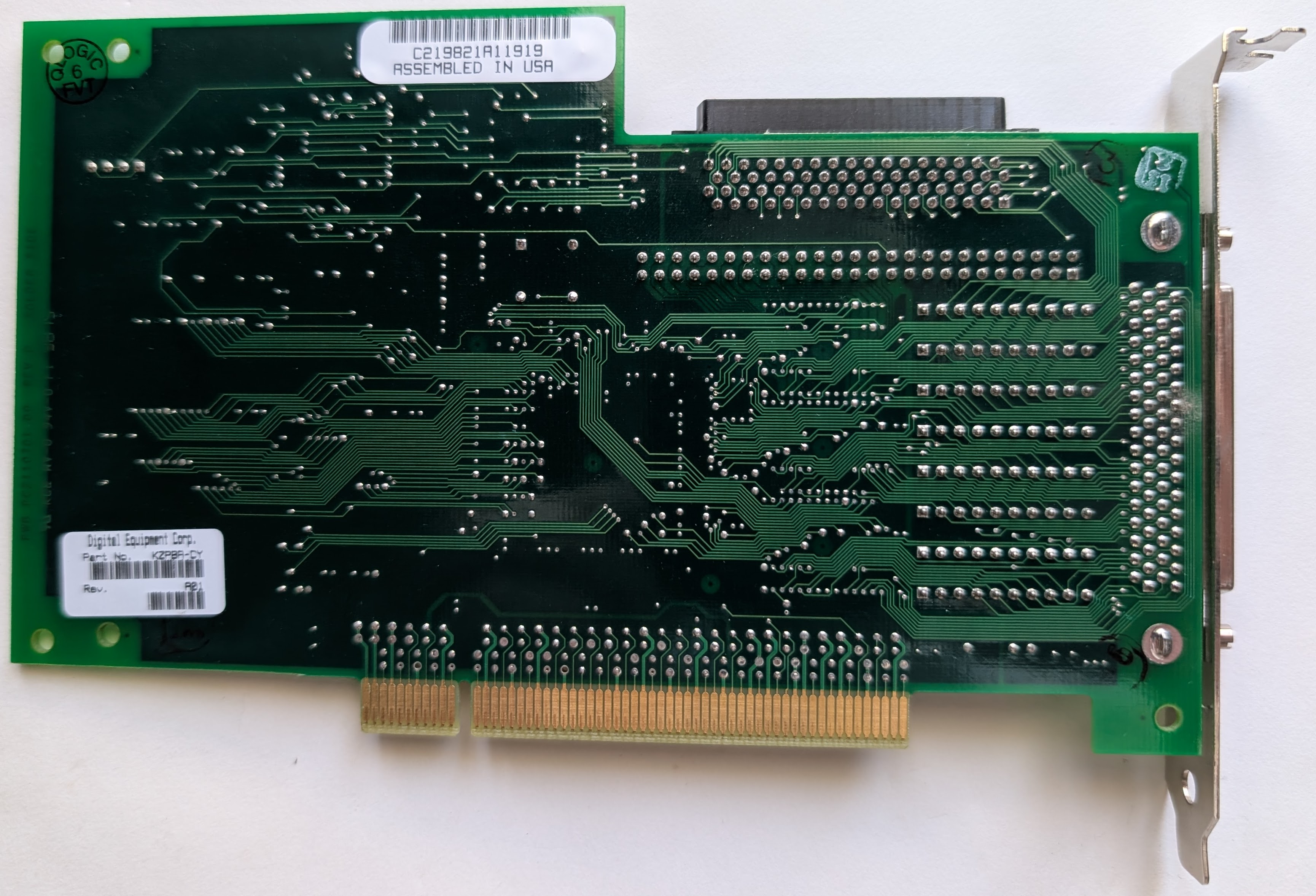 The DEC KZPBA-CY (option KZPBA-CB) is a PCI High Voltage Differential UltraSCSI Host Bus Adapter. DEC seems to have sold these primarily for Alpha workstations and servers, but the manual suggests they should be compatible with x86 PCs as well. The KZPBA was manufactured by QLogic for DEC/Compaq and appears to be based on the QLA1041, though unlike the KZPBA some reports on Usenet suggest the QLA1041 is not compatible with DEC Alpha systems. DEC sold the non-differential variant of this card as the KZPBA-CX (option KZPBA-CA).