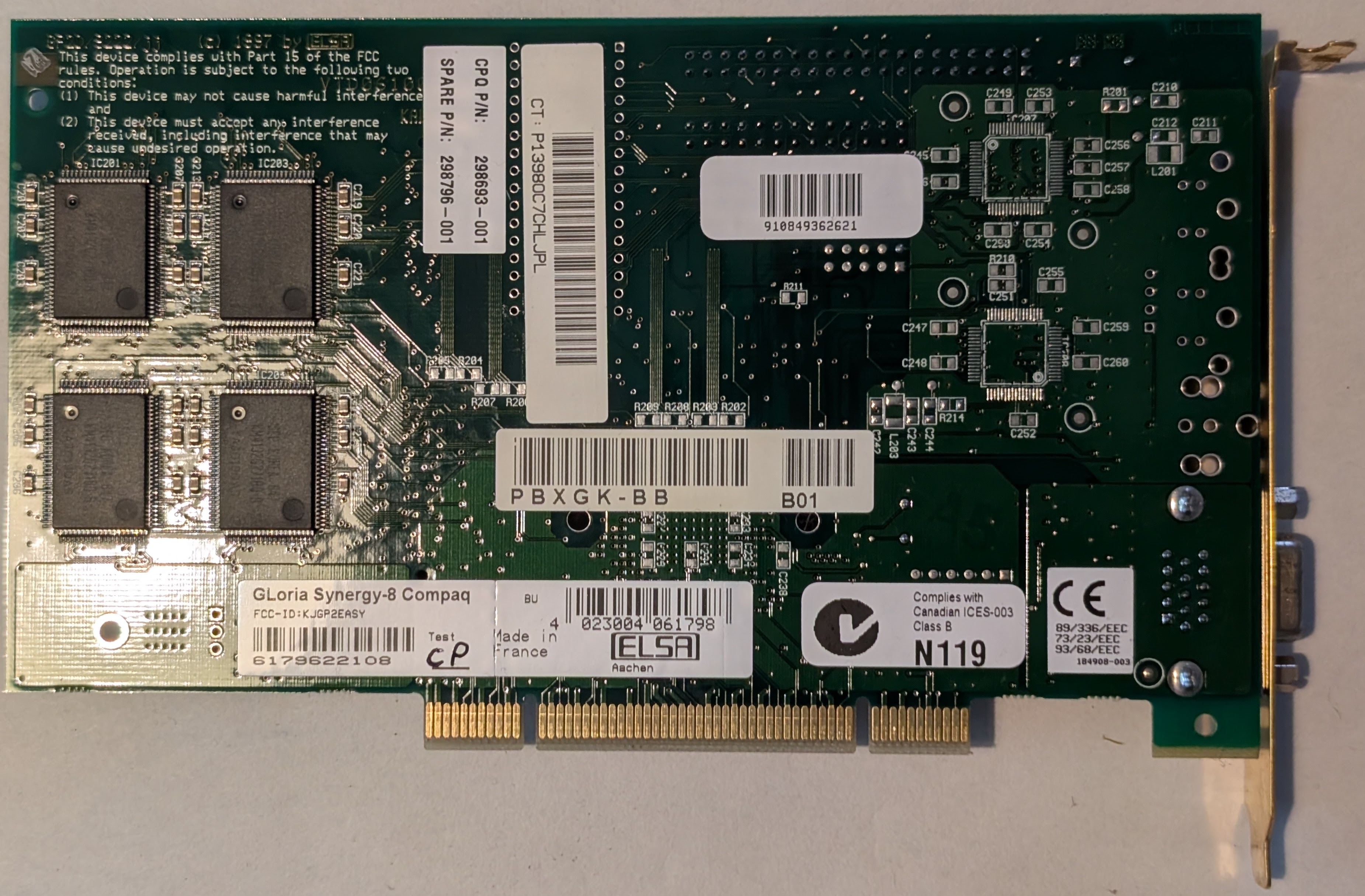 DEC/Compaq sold the ELSA GLoria Synergy-8 as the PBXGK-BB with some sources claiming it was marketed as the PowerStorm 3D10T or 4D10T though its possible these may more correctly refer to another DEC-built card also using the 3Dlabs Permedia 2. The PBXGK-BB has 8MB of RAM with no memory expansion slot or video input. Another variant, PBXGK-BC, was available with video in/out.