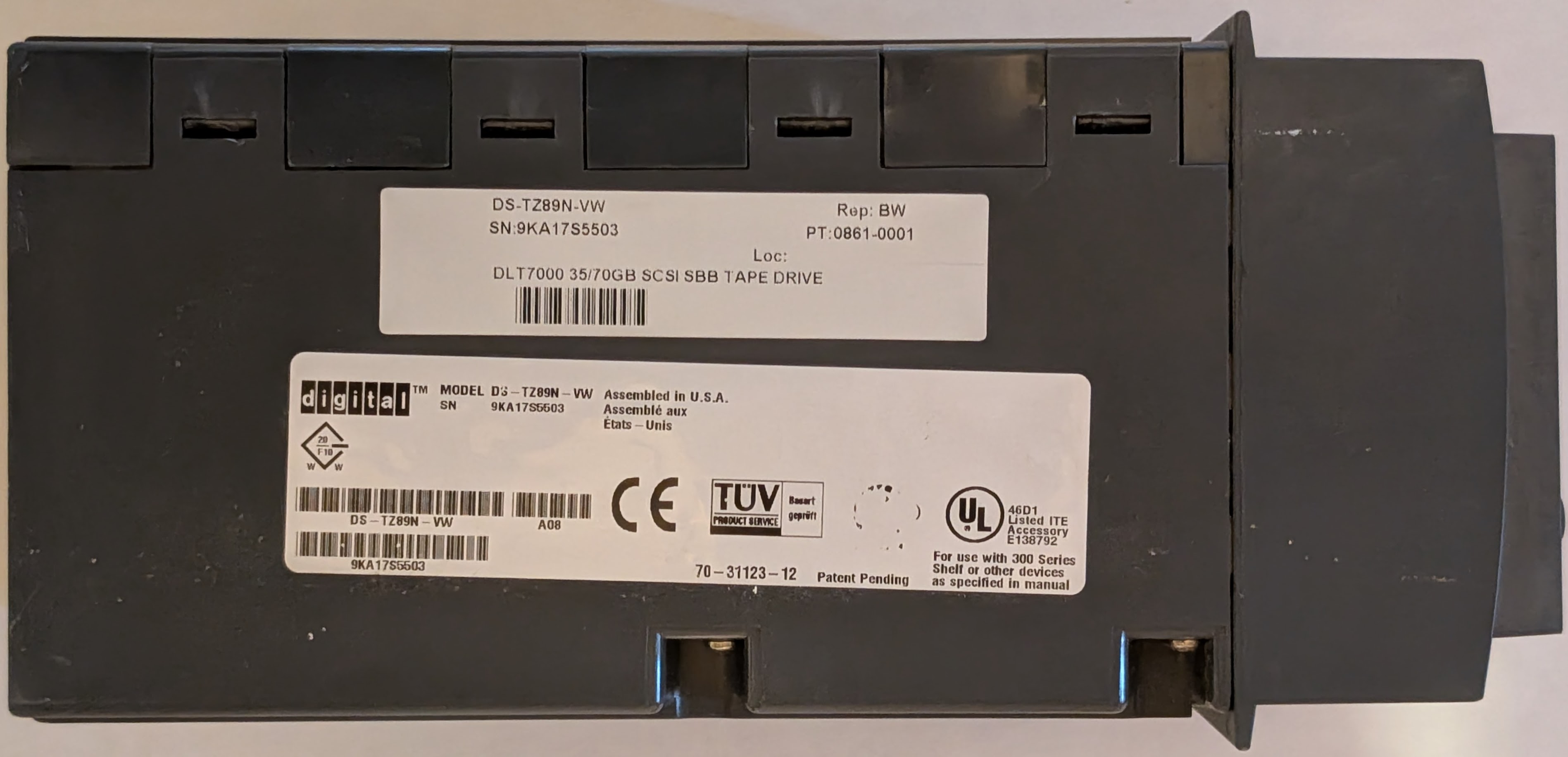 This is a DLT7000 (TZ89) DLT drive in a 5.25" StorageWorks canister which takes up three slots in a StorageWorks shelf. The TZ89 stores 35GB on a CompacTape IV cartridge, or 70GB if you can achieve a 2:1 compression ratio for the data being stored. The drive itself is made by Quantum as DEC sold their tape and disk product lines in 1994.