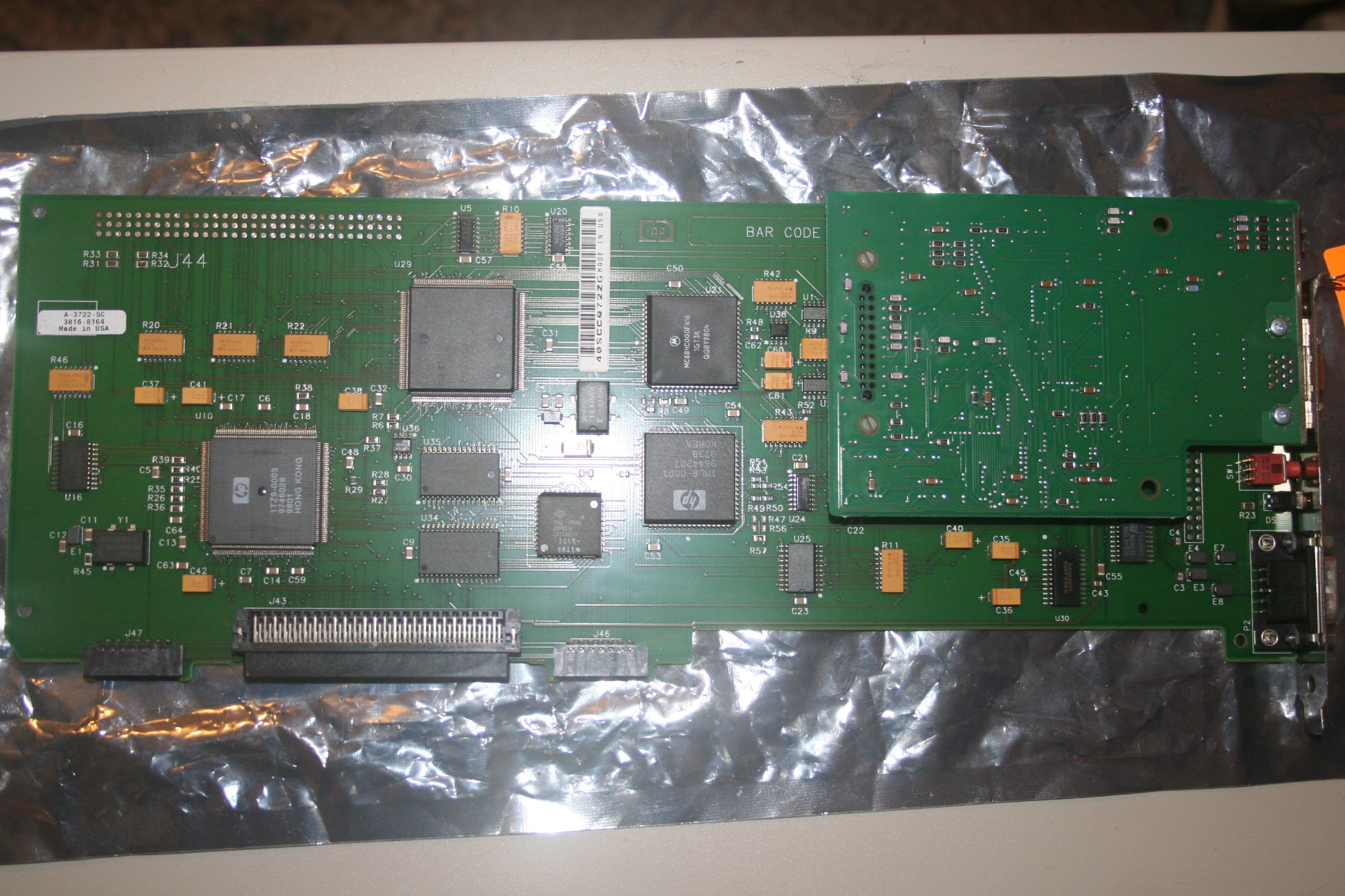 The remote management board. Comes in two PCBs. The small black connector to the right on the bottom edge of the board plugs into a set of pins on the motherboard, along with the large "Turbo HSC" plug next to it.