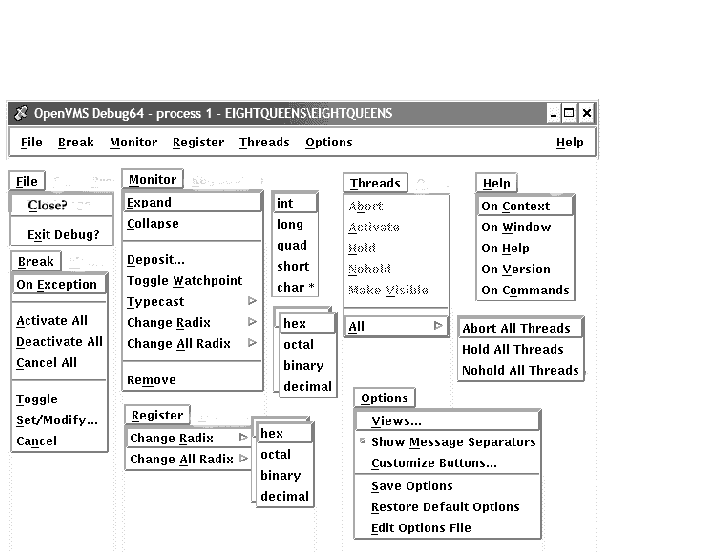 | Change All Radix | Use the submenu to change the output radix for all subsequent monitored elements to hex, octal, binary, or decimal. | |
