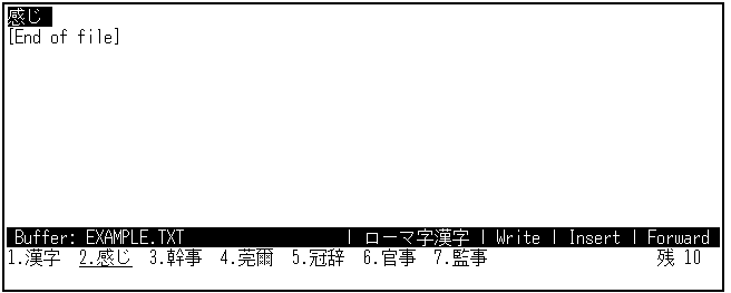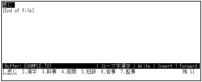 《入力するキー》 ●ローマ字漢字モード⇒ [K] [A] [N] [N] [J] [I] "ん"は,Nを2回入力します。 ●カナ漢字モード⇒ [カ] [ン] [シ] [゛] 変換キー(スペース・バー)を押してください。 "かんじ"が"漢字"に変換され,反転表示された状態になります。 |