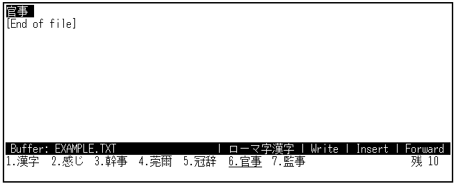 アンダーラインのある候補から数えて,"官事"は4つめにあります。 4回スペース・バーを押すと,"官事"が反転表示された状態になります。 [Return]キーを押して変換を確定します。