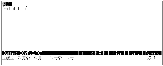 番号を押すと,ただちに変換がその漢字に確定され,画面下部の候補群は消えます。 選択すると同時に確定するために,[Return]キーを押す必要はありません。