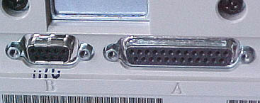 Presented in this picture is the ports on the rear of the machine. I hope you're browsing with images on, as I've labled each port on the photo itself. However, from left to right, is the 50pin SCSI port, the 13w3 Video connection, the DB-15 AUI Ethernet (which, with a transciever, can be adapted to standard 10base-T), the "B" serial port (9pin), the "A" serial port (25pin), the DB-25 parallel port, and the mini-din keyboard port. Note that the smaller, blocked-off opening next to the 13W3 connector is, I assume, for a different framebuffer for the 3/80, which would have had a 9pin connector for the older monochrome monitors which were used on the early Suns.