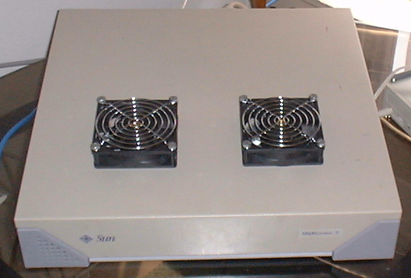 The two following images are by Brian Hechinger who wrote on SunHelp, on Tuesday January 09 2001, regarding my "ultimate fan fack":Hmm. i wanted to put faster drives in my sparc5 (Quantum Atlas, probably the hotest running frickin drives around) so i did something similar. not quite as elegant, since i had to put mine externally due to the limited clearance in a pizzabox. the downside, is this machine has to be on the top of the stack, but that's fine by me.I've included these last two images below:
