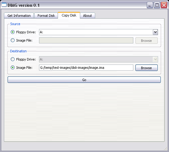 title="The disk copy tab filled in to create an image file from a floppy disk."/>