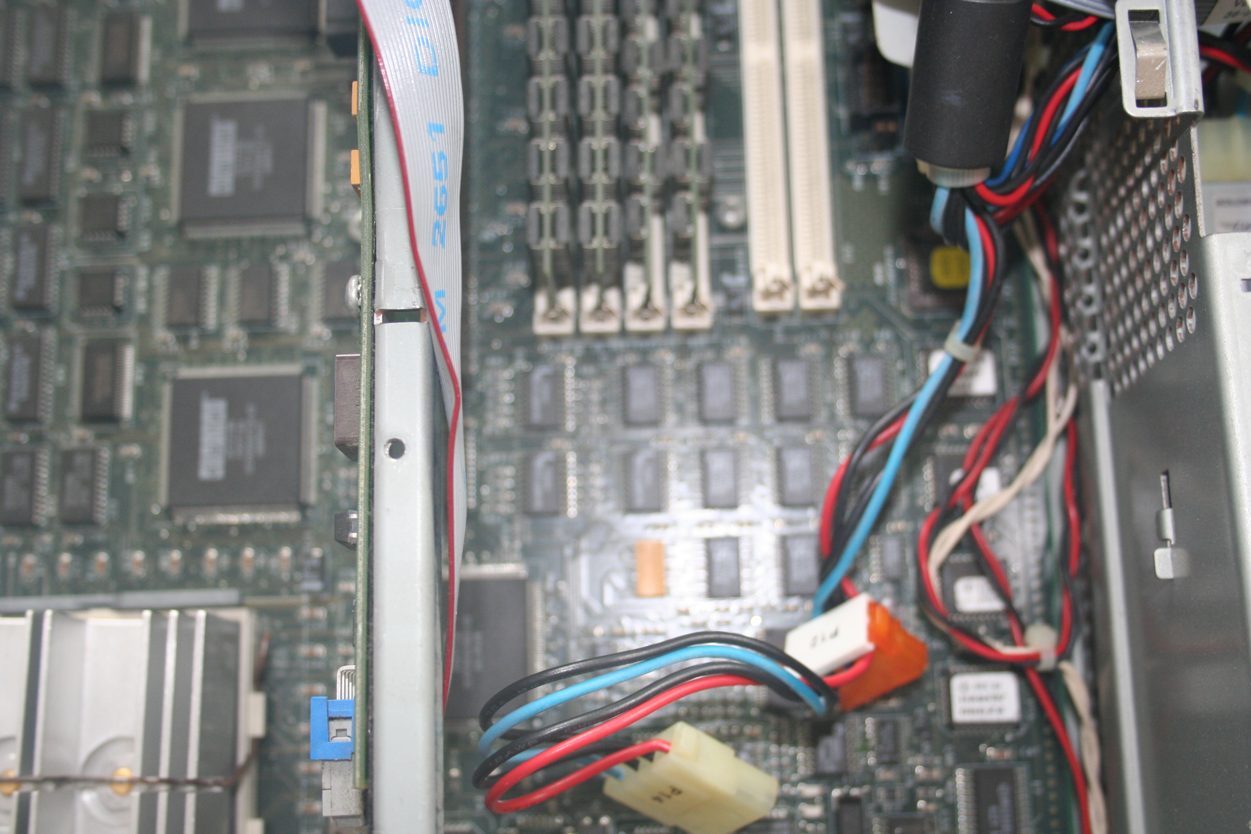 title="Middle of the motherboard. The plug on the left of the riser board at the bottom of the image is the plug that the network board attaches to via a cable."/>