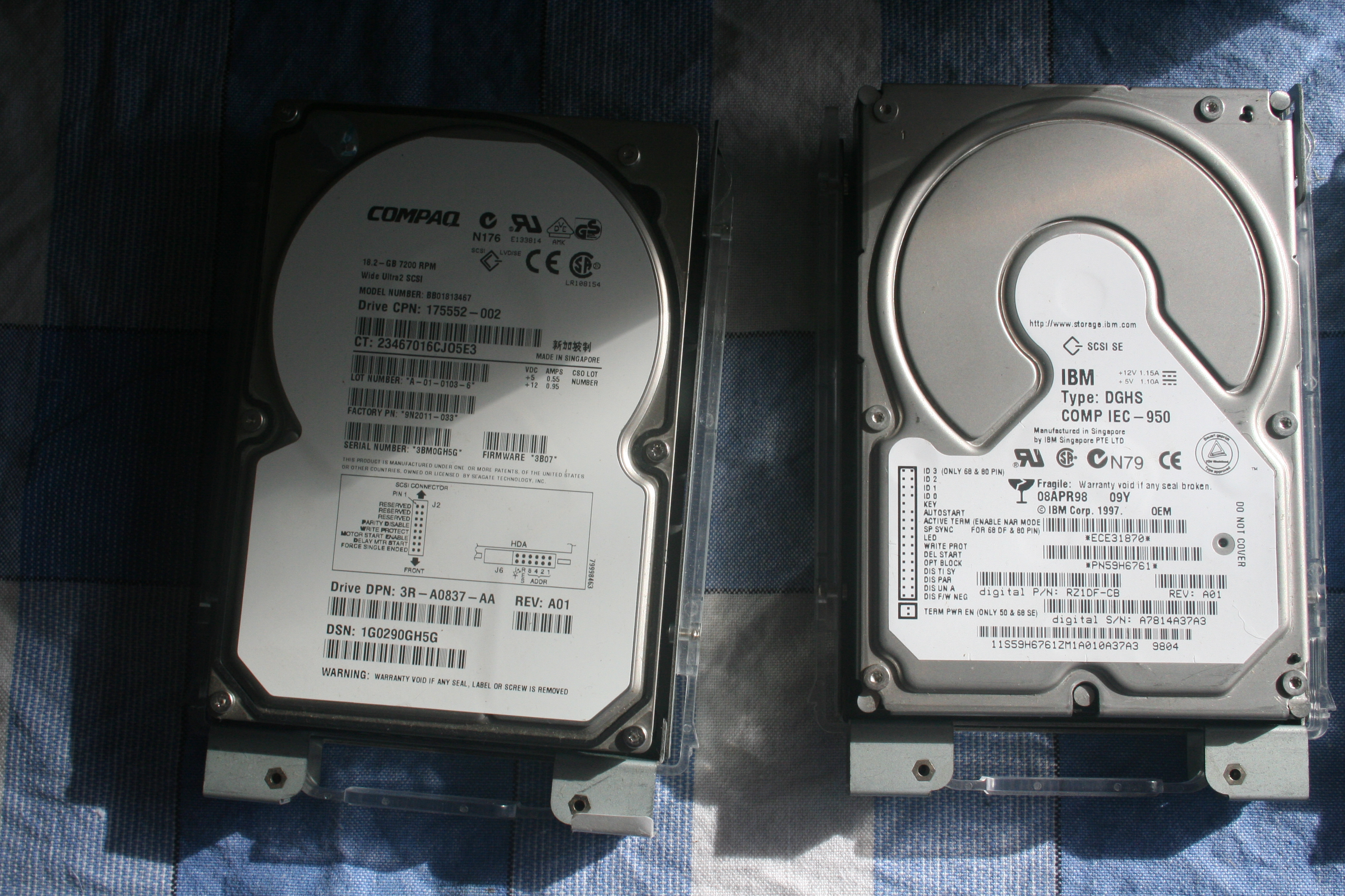 title="The first two drives up close. The left hand one was pulled from a Compaq Server. The right hand one is one of the original drives - an RZ1DF-CB (IBM Type DGHS)"/>