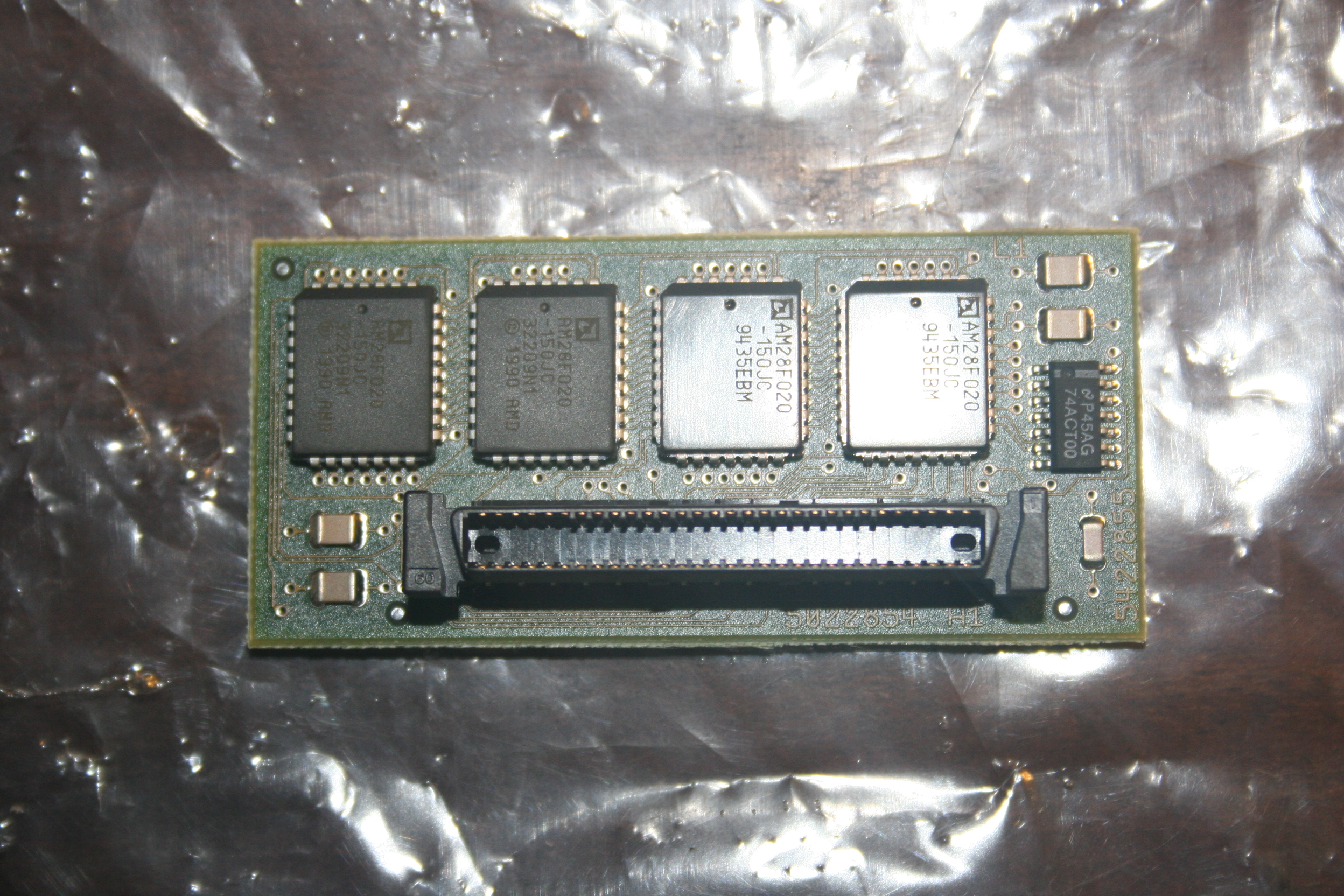 title="The back of the module. The chips are AM28F020 - 2 Megabit (256 K x 8-Bit) Flash Memory. The front of the DECserver 90M claims 1MB of Flash Memory and there are 4* 256K Flash Memory chips here - 1MB."/>