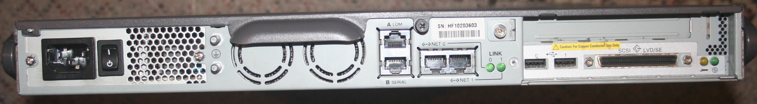The back of the system. Visible from left to right is: Power connector, standby switch, two fans, serial ports A (also lights out management port) and B, Ethernet ports 0 and 1, Link LEDs, USB ports, LVDSE SCSI, Fault LED and Power LED.