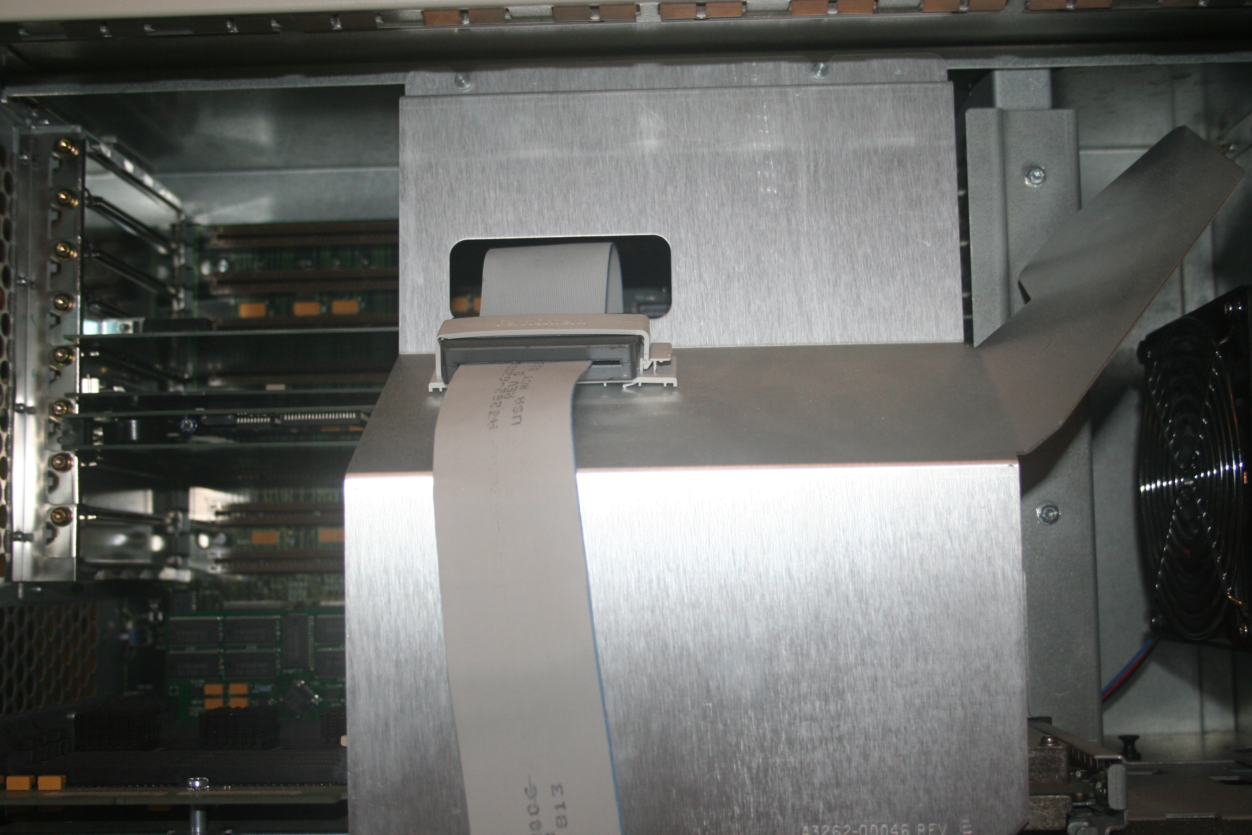 title="Visible is an air baffle covering part of the CPU board and the cards. The SCSI cable goes through a hole in the top."/>