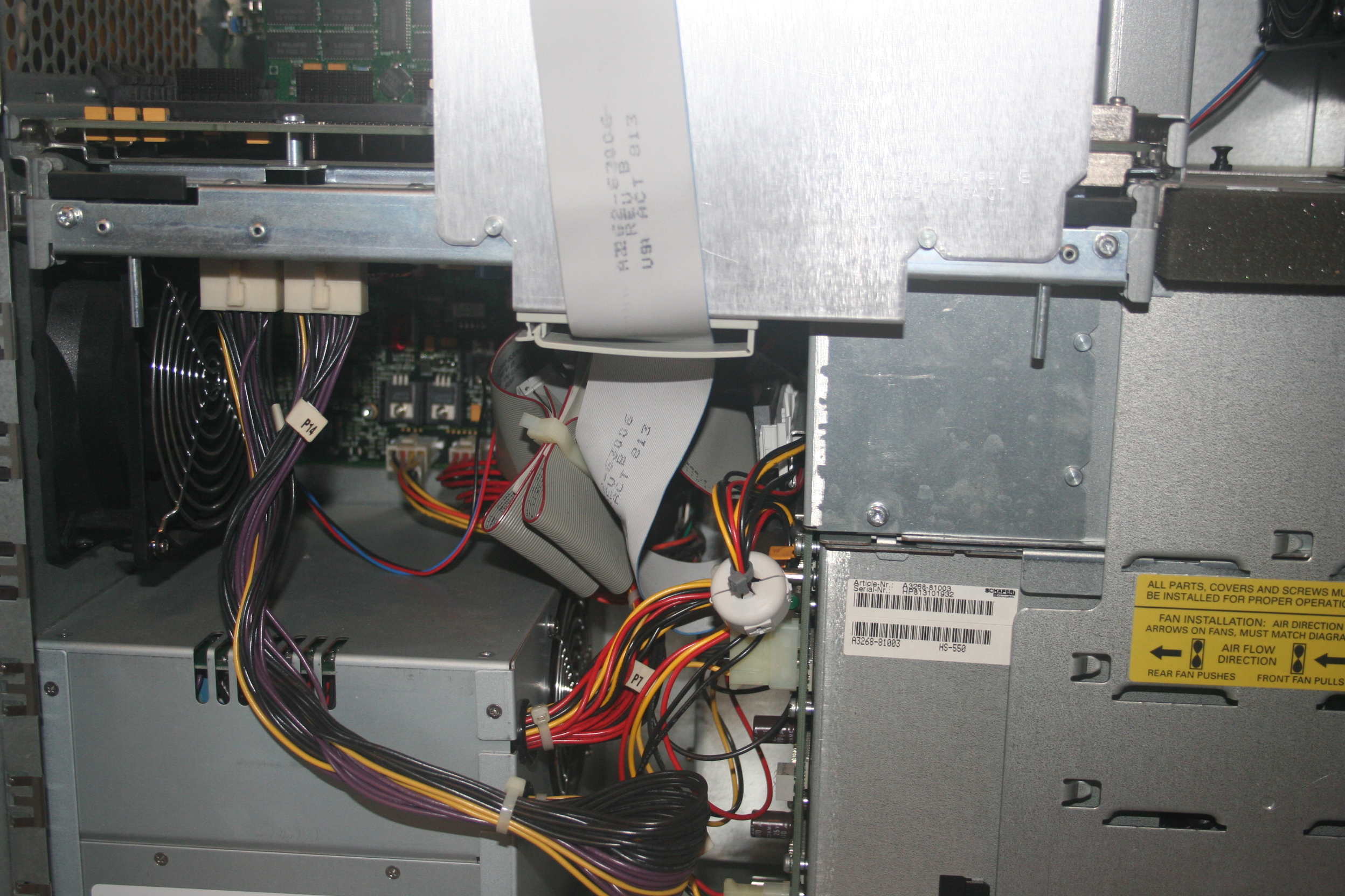 title="The lower section of the system. The PSU can be seen in the bottom left, above it a large fan, on the right is the drive cadge."/>