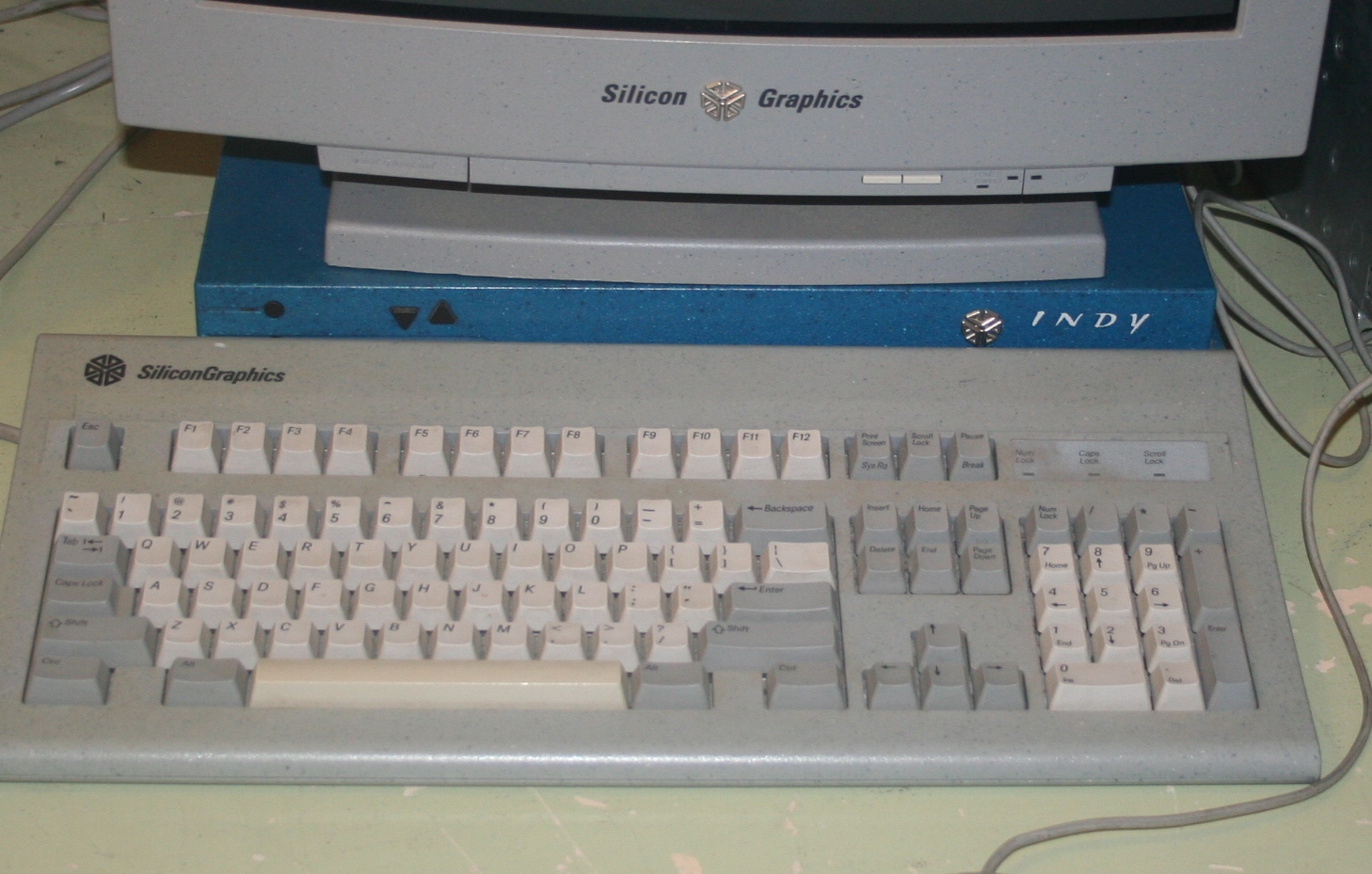 The system unit, almost hidden behind the keyboard and under the monitor. It has power and volume control buttons on the front, plus a paper-clip accessible reset button.
