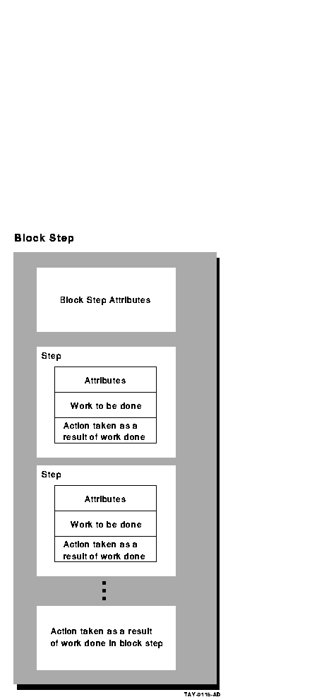 The work of a block step consists of the exchange and processing steps that it contains. The task itself contains overall characteristics that affect the block step and its work. Figure 2-1 shows the structure of a task definition and, in addition to an exchange and processing step, includes a block step that contains attributes and actions taken as a result of the work done.
