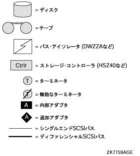 SCSI バスは,最高で 16 個のデバイスをサポートできる I/O インターコネクトです。 Narrow SCSI バスは,最高で 8 基のデバイスをサポートします。Wide SCSI バスは,最高で 16 個のデバイスをサポートします。サポートできるデバイスには,ディスク・ドライブやテープ・ドライブなどのホスト・アダプタ,周辺コントローラ,ディスクリート周辺機器があります。0 から 15 までの固有の ID 番号でアドレス指定します。デバイス ID を割り当てるには,コンソール・コマンドを入力するか,ジャンパまたはスイッチを設定するか,StorageWorks エンクロージャのスロットを選択します。