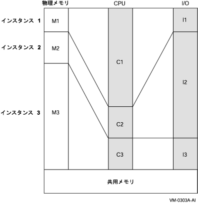 OpenVMS Galaxy では,リソースをまったく共用せずに, 1 つ以上の OpenVMS インスタンスを実行できます。 リソースを共用しない OpenVMS インスタンスを 独立インスタンス と呼びます。