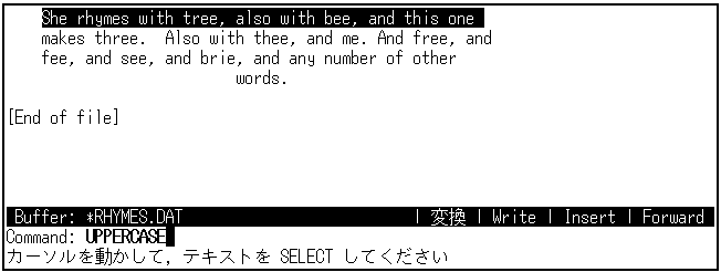 下の例では,1行目のテキストをすべて大文字にします。カーソルをSheという単語の最初の文字に移動し,[Select]キーを押します。次に,カーソルを選択領域の最後に移動します。ここでは1行目の最後,つまりoneの後に移動し,UPPERCASEコマンドを入力します。
