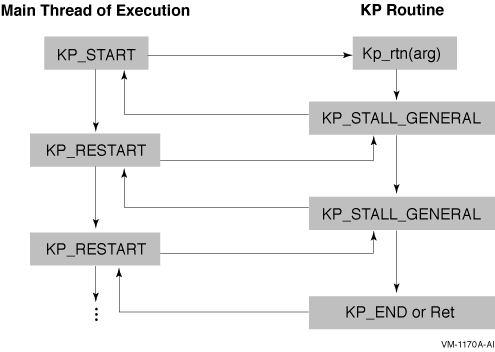 KP ルーチンは,EXE$KP_START を呼び出すことで開始されます。 KP ルーチンは,実行中に EXE$KP_STALL_GENERAL を呼び出すことで,制御を放棄することができます。ストールされた KP ルーチンは,EXE$KP_RESTART を呼び出すことで再開できます。 KP ルーチンは,EXE$KP_END を明示的に呼び出すか,またはルーチンから戻ることで終了します。ルーチンから戻る場合は,KP サービスは EXE$KP_END を暗黙に呼び出します。