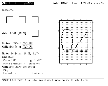 标题 "参考" 下面的左上角有三个小窗口, 是给 REFER 功能用来显示当前系统属性数据库或内存记录的字形的。字形按其实际大小显示, 用户在设计新字形时可以这些字形作为参考。有关如何使用 REFER 的详情, 请参阅 6.6.5 节中的描述。