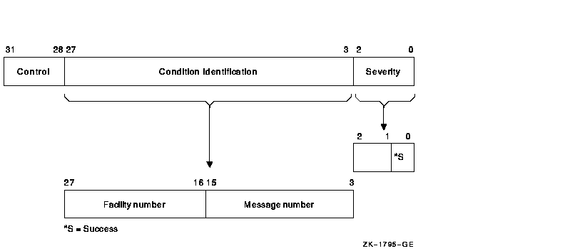 The first word contains a condition value indicating the success or failure of the operation. The condition values used are the same as for all returns from system services; for example, SS$_NORMAL indicates successful completion.