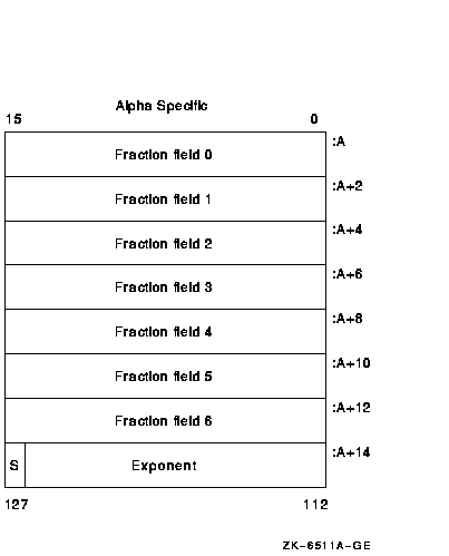The structure of a T_floating datum follows (Alpha and I64 systems only). It contains four fraction fields. Note that fraction field 1 holds the most significant bits, and the field 4 extension holds the least significant portion of the fractional number.