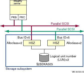 When any node has multiple buses connecting to the same storage device, the new HSZ allocation class shown in Figure 6-15 must be used.
