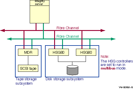 Figure 6-16 shows a multipath configuration with both a tape storage subsystem and a disk storage subsystem. Note that the disk storage controllers are configured in multibus mode.