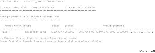 The VALIDATE PROCESS command validates the process indicated by one of the following: process-name, the process specified in the /ID or /INDEX qualifier, the next process in the system's process list, the system process, or all processes. The VALIDATE PROCESS command performs an implicit SET PROCESS command under certain uses of its qualifiers and parameters, as noted in Section 2.5. By default, the VALIDATE PROCESS command validates the SDA current process, as defined in Section 2.5.Currently, the only validation available is to check free pool packets for POOLCHECK-style corruption. The command is useful only if pool checking has been enabled using either the POOLCHECK or the SYSTEM_CHECK system parameters. (For information on these system parameters, refer to the HP OpenVMS System Management Utilities Reference Manual or to the Sys_Parameters online help topic.)