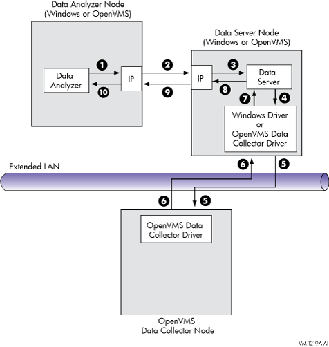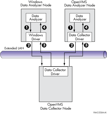 The Data Analyzer and Data Collector communicate over an extended LAN using an IEEE 802.3 Extended Packet format protocol. Once a connection between the Data Analyzer and the Data Collector is established, the Data Analyzer instructs the Data Collector to gather specific system and process data.