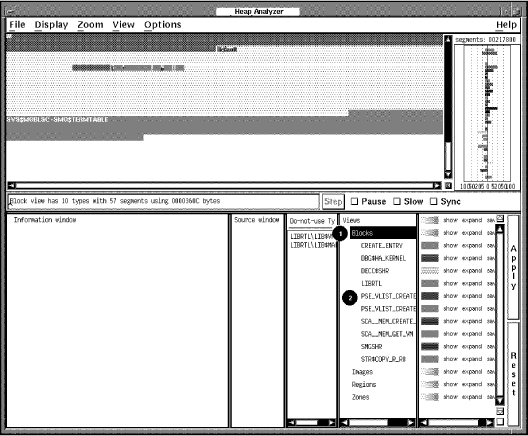 各メモリ・マネージャが認識している個々のセグメント・タイプを表示するには,「Blocks」,「Images」,「Regions」,「Zones」の各キーワードを MB1 でダブル・クリックして,省略時設定の表示を拡大します。それぞれの表示を元に戻すには,前に選択したキーワードを MB3 でクリックします。