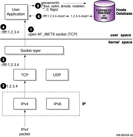 AF_INET6 sockets can receive messages sent to either IPv4 or IPv6 addresses on the system. An AF_INET6 socket uses the IPv4-mapped IPv6 address format to represent IPv4 addresses. Figure E-3 shows the sequence of events for an application that uses an AF_INET6 socket to receive IPv4 packets.
